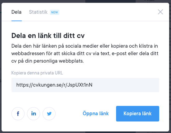 Att dela en länk är ett bekvämt och modernt sätt att skicka ditt cv och personliga brev på, via e-post, sociala medier, eller till och via ett textmeddelande. Dessutom kan du använda våra premium-designteman online gratis utan att uppgradera till ett premiumkonto.