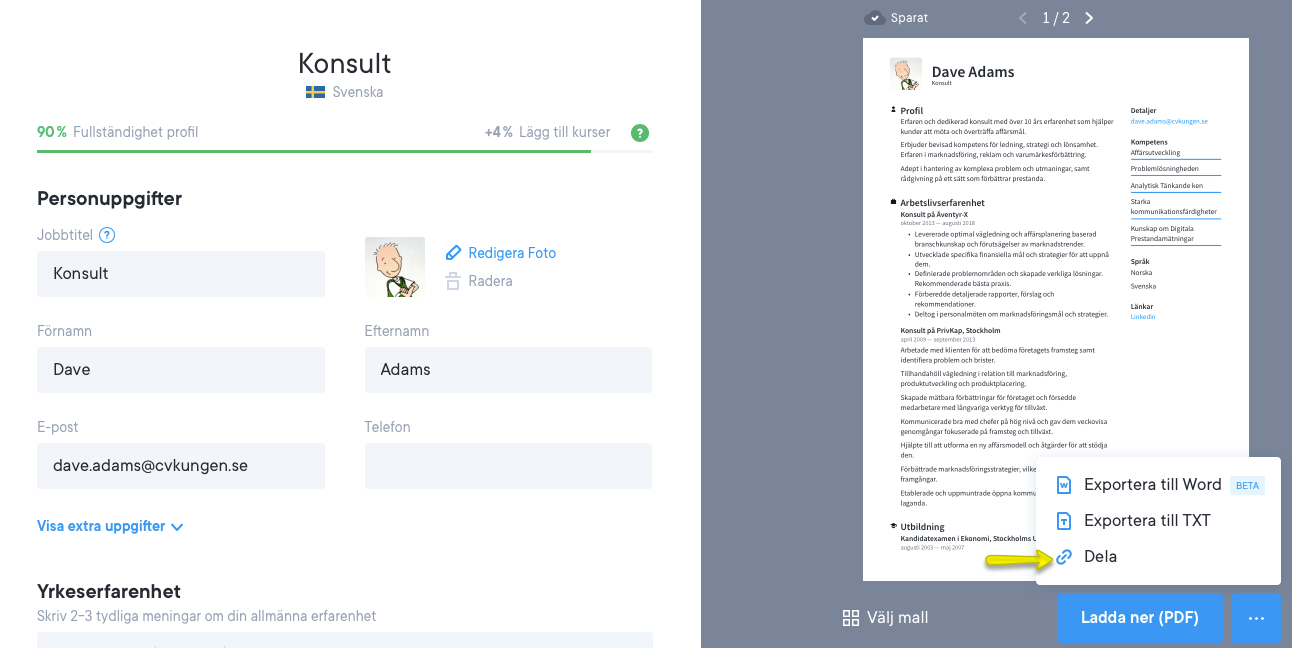 När ditt cv är klart kan du använda cvkungen.se för att dela en online-länk till ditt cv - helt utan kostnad. Som standard är ditt cv privat och delas bara om du väljer att använda våra delningsfunktioner. Du kan enkelt ladda ner en PDF-fil av ditt personliga brev för att spara och dela det med potentiella arbetsgivare.