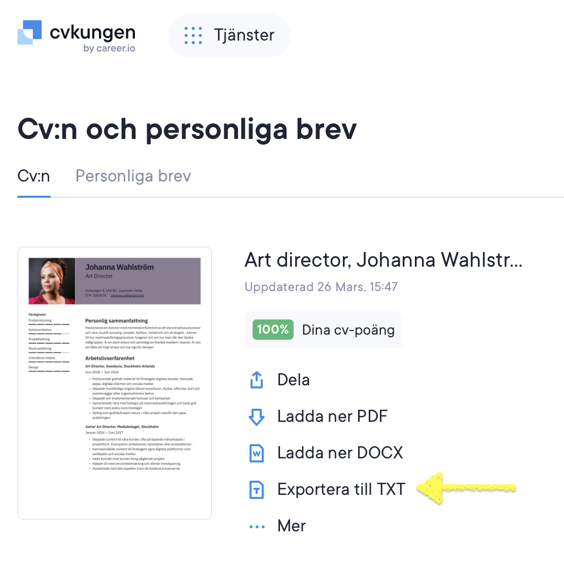 När du använder det kostnadsfria kontot på cvkungen.se kan du ladda ner ditt CV som PDF (med Vancouver-mallen) eller som en TXT-fil.