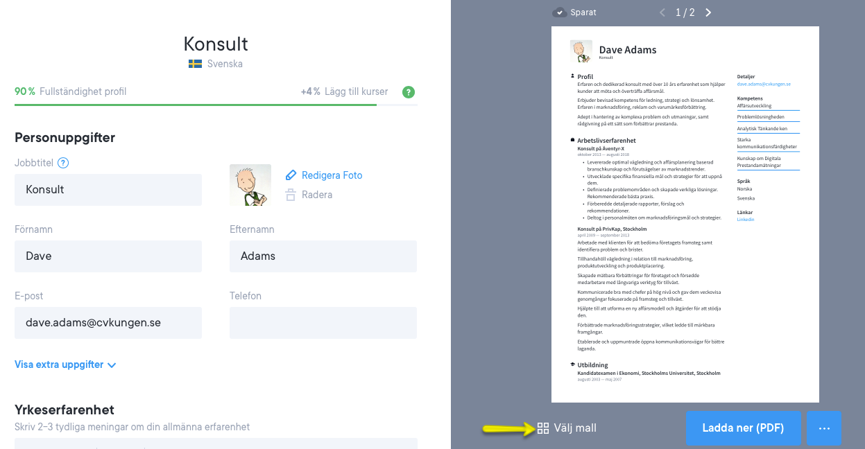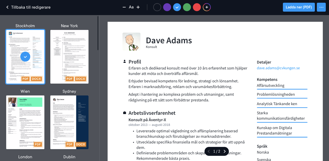 När du har skapat ditt cv kan du ändra designen eller mallen med ett enda klick. Gå först till det cv du vill ändra och klicka på det för att redigera. Till vänster visas olika cv-mallar som du kan välja mellan. Se skärmdumpen nedan.