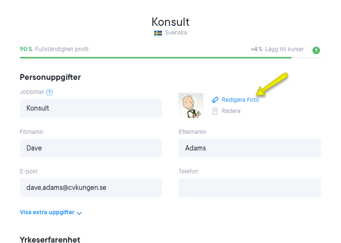 För att lägga till ett foto i ditt cv loggar du in på ditt konto och klicka i för att redigera ditt CV. Därifrån klickar du på det första avsnittet Personuppgifter.