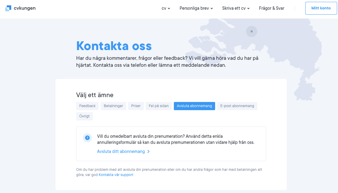 Du kan avbryta ett cvkungen.se-abonnemang direkt från vår hemsida utan att ens logga in i appen. För att göra det besöker du vår kontaktsida här och klickar sedan på alternativet "Avbryt abonnemang" från menyn.
